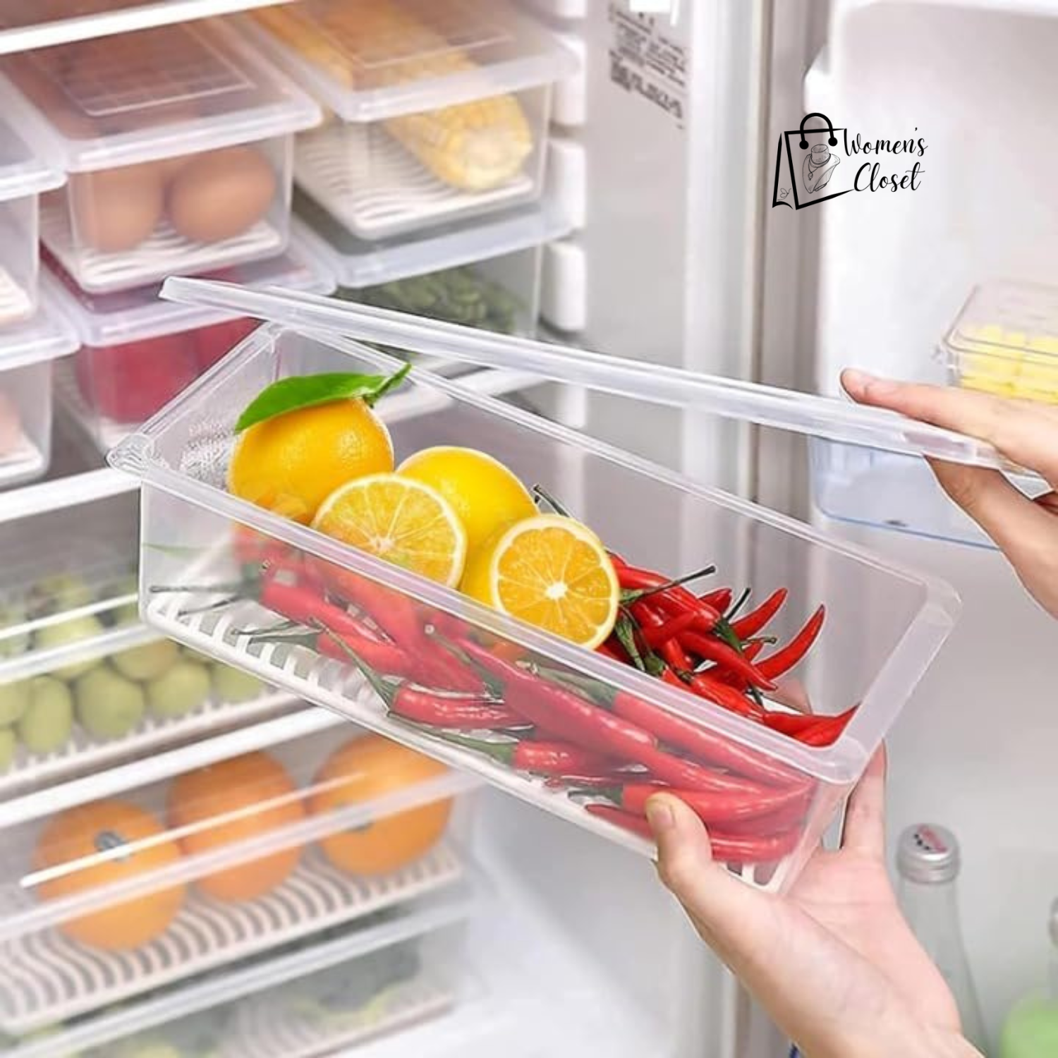 Keep your fridge neat, clean, and organized with women’s closets Fridge Storage Boxes with Removable Drain Plate (Pack of 6). Perfect for storing fruits, vegetables, fish, or leftovers — these boxes keep your food fresh, dry, and hygienic for longer.