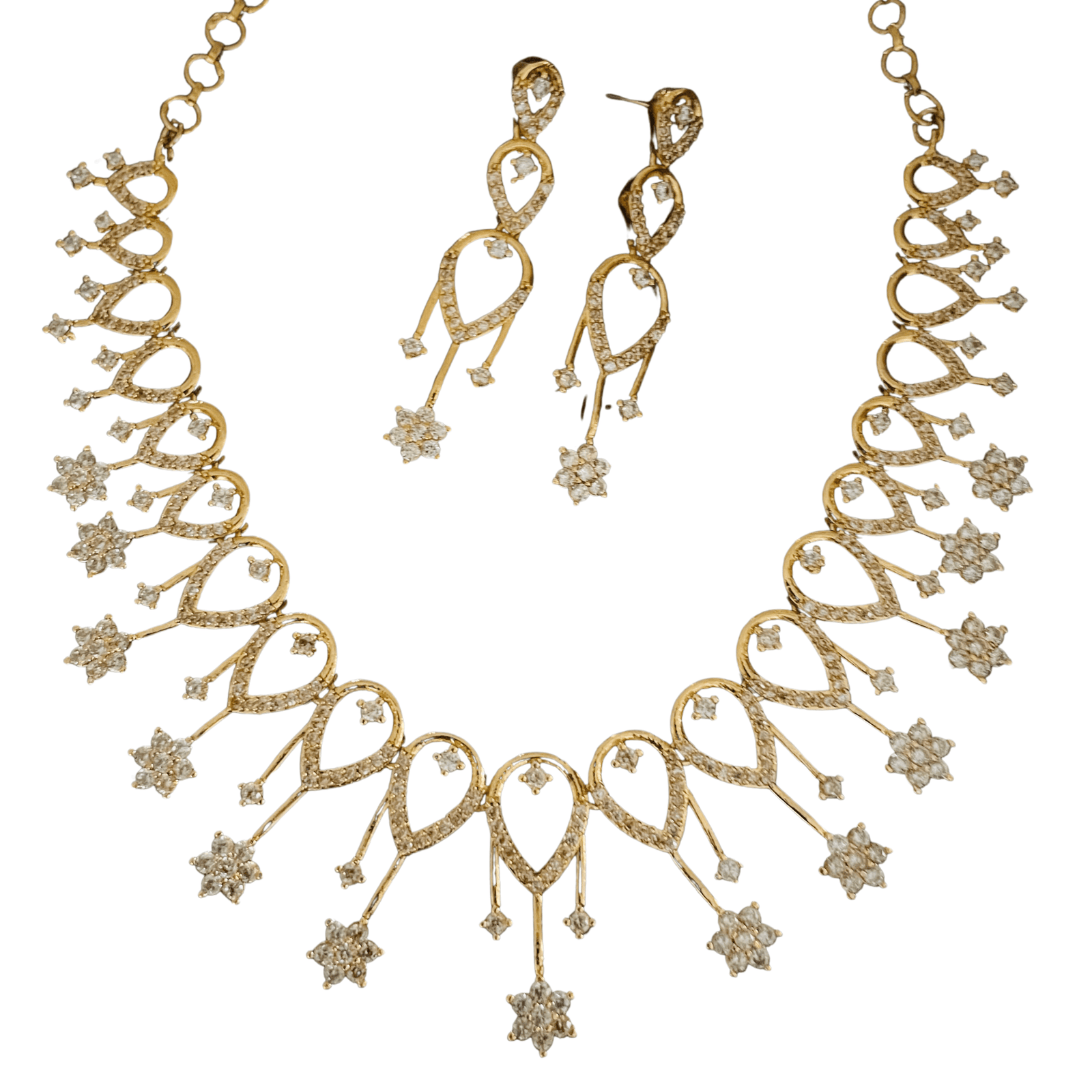 Paired with matching drop earrings that mirror the intricate design, this set makes the perfect accessory for weddings, parties, or any celebration where you want to turn heads. Lightweight, versatile, and effortlessly graceful, this piece is a must-have in every modern woman’s jewelry box.